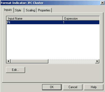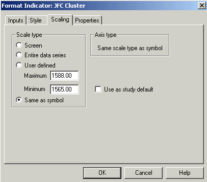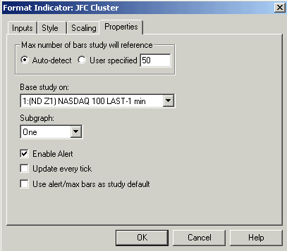 The JFC Cluster Indicator should have its Scaling tab set to Same as price data. Other available settings, while useable, will result in a plot which will be considerably more difficult to interpret.