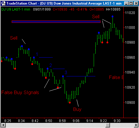 Note that at the appearance of the first false buy signal, the buy stop would have been placed at point #1, the level of the most recent entry point plot. Recalling that we must have at least two bars of data present to the right of the marked bar , the #2 point would not be useable here as the program would not have sufficient data at this point to place the blue dot in real time charting.