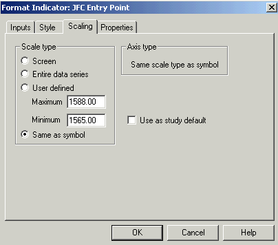 It is vital to the proper performance of this support and resistance generating indicator that the scaling always be set to Same as price data. Improper interpretation will occur with other settings.
