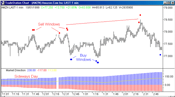 The programming for this tool acts in such a manner that the conditions which are required to qualify the price bar in question for a red or blue dot may be satisfied while the bar is forming but not be satisfied when the bar is completed. Since this is the case, a dot could appear above or below a bar while the bar is being formed but not disappear when the bar closes. It is thus possible to get a false signal from this indicator by checking the Update every tick box. It is strongly suggested that you not do so.