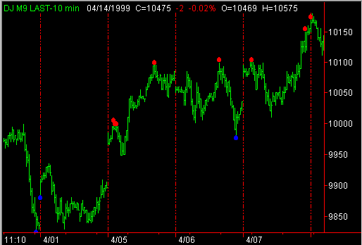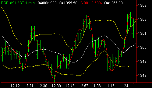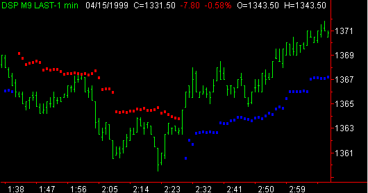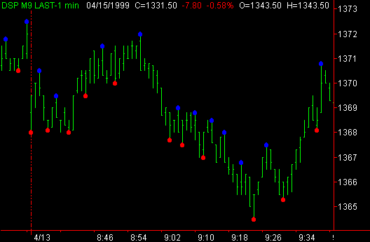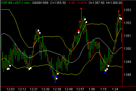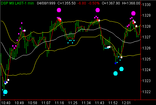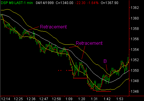Although the primary use of the exhaustion indicator is the identification of turning points, there is alternative interpretation which can be used in a trending market. When a trend is identified with the use of the Market Direction Indicator, the Volume Direction Indicator and the Intraday Hi - Lo Indicator, the Exhaustion Indicator can be used to identify retracement points at which entries can be taken inthe direction of the persistent trend. In the chart to the left note the activity of the market when the red line pulls back between the yellow bands and briefly encounters the white line. These retracement areas frequently provide excellent entry opportunities. Also, note the difference in the pattern at point B when the red line proceeds abruptly through the white line and proceeds through the upper yellow band before it goes back below the white line. This pattern, following multiple retracement signals, often signals the end of the short term trend. Note the presence of the Intraday Hi - Lo indicator (small red dots) as it identifies the new lows being made by the market as the floor traders run the stops below the low of the day. Use this indicator in an automated Trading System : Four Steps Level Two Indicators & Systems Contact