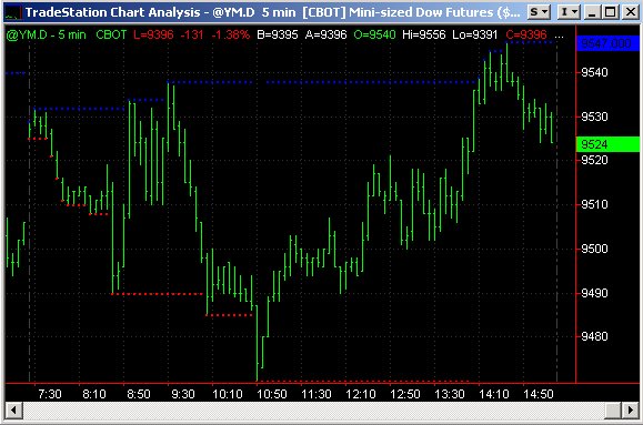 The appearance of a blue dot above a price bar indicates that this bar is a significant high defined by the sensitivity settings of the indicator. The appearance of a red dot below a price bar indicates that this bar is a significant low defined by the sensitivity settings of the indicator. Entry Options User Customizations Inputs: Strength: Practical range will be 2 - 5. Two will probably be optimum. Lower numbers will give a higher sensitivity. The most important aspect of this indicator is to realize